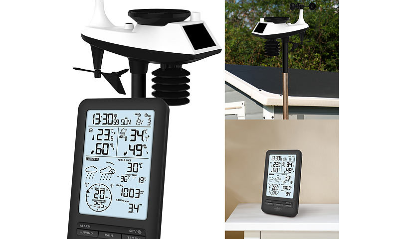 Umfangreiche und präzise Auswertung: Neben der Innen- und Außentemperatur kann man auch die gefühlte Außentemperatur ablesen. Zudem sieht man die Niederschlagsmenge sowie Windstärke mit Windrichtung. So verlässt man auf jedes Wetter bestens vorbereitet das Haus!