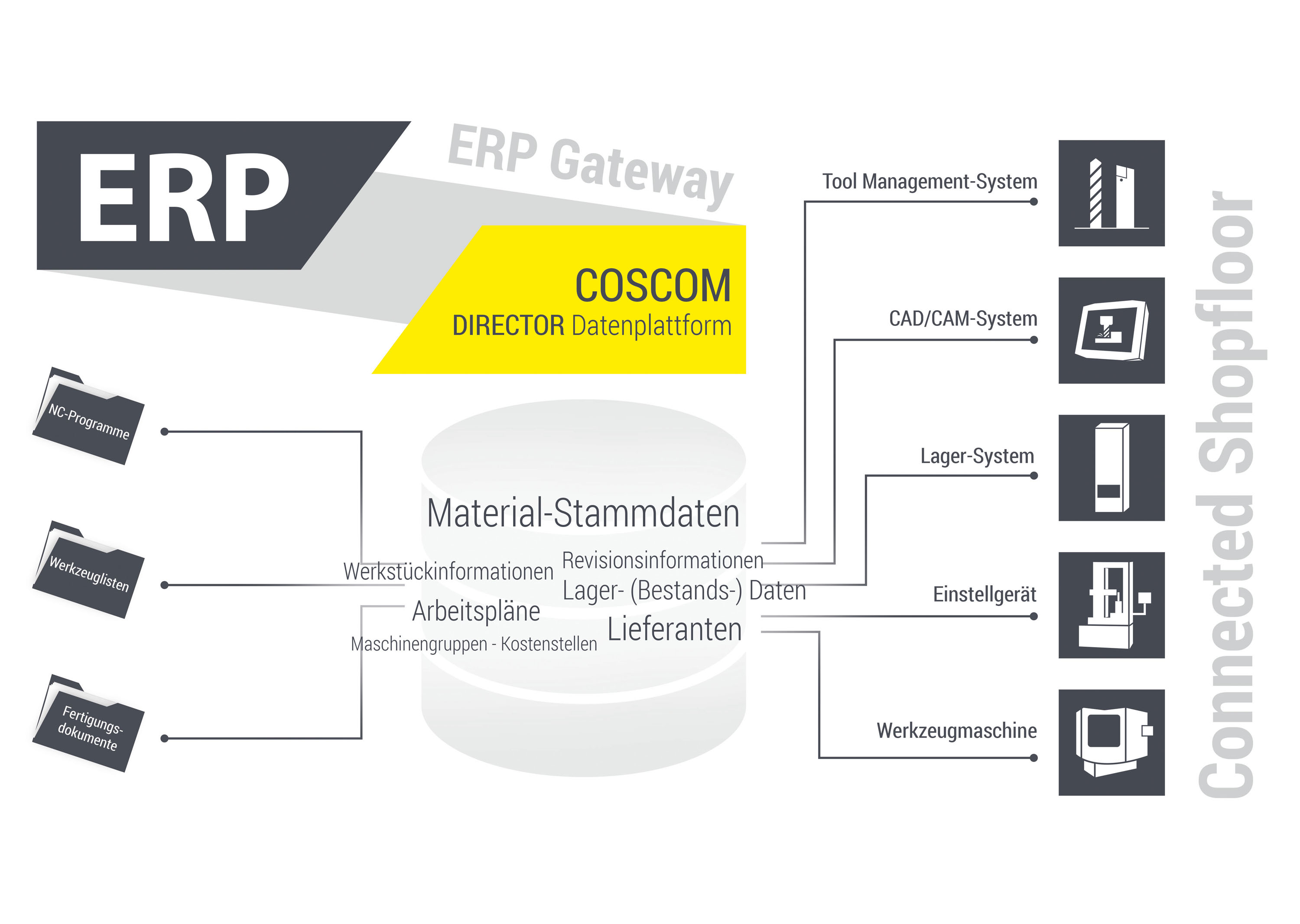 Mit dem FactoryDIRECTOR hat sich COSCOM eine universelle Lösung der Datenvernetzung ERP und Fertigung zum Thema gemacht. Hierbei handelt es sich um eine Datenbankanwendung, die genau in der Schnittstelle zwischen Officefloor und Shopfloor zum Einsatz kommt. Im gesamtheitlichen Datenprozess positioniert sich der FactoryDIRECTOR klar unterhalb des ERP-Systems, ERP-Daten werden um fertigungstechnische Informationen angereichert und im Shopfloor entsprechend zur Verfügung gestellt. Das Besondere an dieser Software-Lösung liegt in seiner Kompatibilität. Der COSCOM FactoryDIRECTOR ist das datentechnische Bindeglied zwischen dem ERP-System und der operativen IT-Systeme (CAD/CAM, Simulation, ToolManagement, Werkzeugvoreinstellung, Maschinen, usw.) im Shopfloor. Die Vielfalt der Shopfloorsysteme wird auf einen „datentechnischen Nenner“ gebracht und so auch eine zentralisierte Kommunikation zum ERP-System erreicht. Die COSCOM-Shopfloorkompetenz verschmilzt mit den Kompetenzen des ERP-Anbieters zu einem einheitlichen Datenprojekt beim Anwendungsunternehmen.