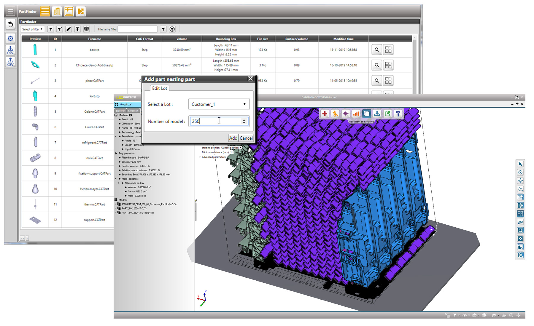 Mithilfe der neuen Funktion werden die in der systemeigenen Datenbank hinterlegten CAD Modelle wie in einem Webshop bestellt und automatisch an den Printer gesendet. Die Anordnung und Orientierung der Bauteile, das sogenannte Nesting, findet hierbei automatisch statt und bedarf keinerlei 3D Printing Knowhow des Anwenders. Hierdurch wird der bis dato aufwendige manuelle Vorgang der Maschinenbeschickung deutlich vereinfacht und beschleunigt. Das System ist in den sogenannten Partfinder intergiert, der das Auffinden und Sortieren geeigneter Teile für bestimmte Verfahren und Maschinen ermöglicht.