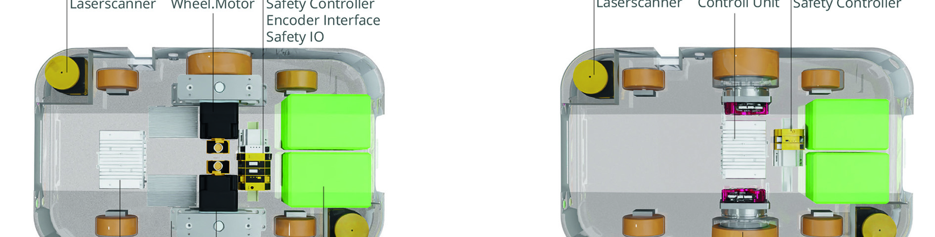 Und nicht nur die Kommunikation über FSoE macht die neue Systemarchitektur so besonders, auch die einzelnen Komponenten stechen aus der Masse hervor: Im Gegensatz zu aufwendigen mechanischen Lösungen ist der Antrieb ultrakompakt dank des getriebelosen Radnabenmotors i-Wheel Clever von Ketterer. Mit dem vollintegrierten Motion Controller Circulo 9 von Synapticon ist das System zudem intelligent und funktionssicher. Die Antriebe kommunizieren mit dem übergeordneten Safety Master Controller, der die Signale einer erprobten Schutzfelderkennung sicher verarbeitet und das Antriebssystem steuert.