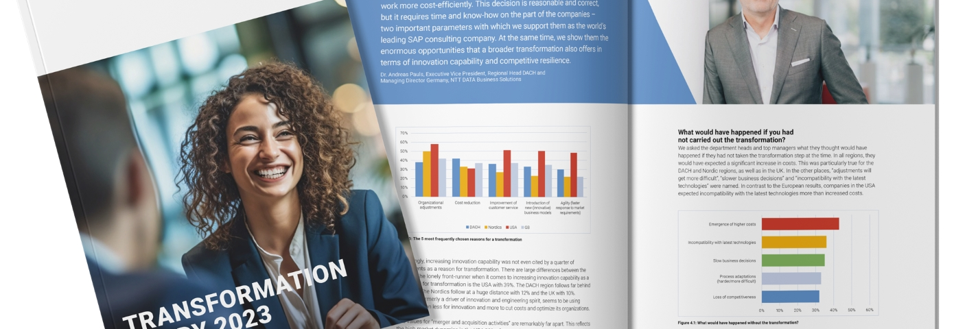 Bielefeld/Walldorf, Germany – SAP® consultancy NTT DATA Business Solutions AG and IT service provider Natuvion GmbH jointly published the international „2023 Transformation Study.“ The study provides detailed insight into the motivation behind transformation projects within companies, the strategies and methods applied, and the major challenges in the transformation process. Over 600 CIOs and CEOs from successful SMEs around the world were surveyed for the study in 2022. They all have one important factor in common: They transformed their IT system landscape within the last two years. The study makes it clear that companies are under significant pressure to undergo this transformation, but their desire to do so is also very high. Among the regions surveyed, differences particularly arose in answer to the question of which goals the companies wanted to achieve via the digital IT transformation process.