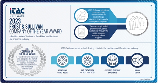Montabaur, 22. Januar 2024 – Die iTAC Software AG wurde von Frost & Sullivan als „Company of the Year 2023“ in der MedTech- und Life-Sciences-Branche ausgezeichnet. Dieser Award bestätigt die führende Position von iTAC im deutschen MOM/MES-Markt. Das Unternehmen, das zum Dürr-Konzern gehört, hat durch innovative Lösungen und einen klaren Kundenfokus sowie eine starke Rolle im Markt – bei einem Wachstum von 10 % im Jahr 2023 – überzeugt.