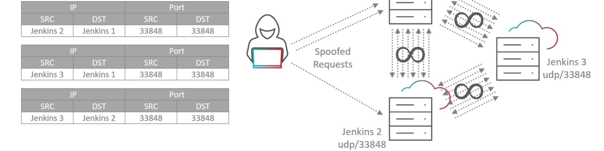 Sorgfältig gestaltete UDP-Pakete können auch zwei Jenkins-Server in eine Endlosschleife von Antworten bringen, wodurch ein Denial-of-Service gegen beide Server verursacht wird. Dies ist möglich, weil der Jenkins-Discovery-Service auf jede Anfrage reagiert, unabhängig von deren Inhalt. Ein UDP-Paket, das als Quelle die IP eines exponierten Servers und als Ziel die IP eines anderen exponierten Jenkins-Servers verwendet, wobei sowohl Quelle als auch Ziel auf den Port udp/33848 des Jenkins-Discovery Service gesetzt sind, gehen beide Jenkins-Server in eine unendliche Antwortschleife. Ein böswilliger Akteur wäre laut Radware zudem in der Lage, mehrere unendliche Antwortschleifen zwischen beliebigen exponierten Jenkins-Servern im Internet zu erstellen, wodurch schließlich ein vollständig vermaschter, unendlicher Strom von Paketen zwischen den exponierten Internet-Hosts entsteht.