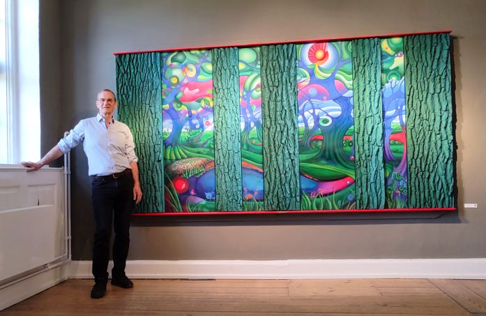 „Der Baum ist länger auf der Erde als wir“, sagt Brandt und verweist auf tausendjährige Eichen. Eines seiner Rinden-Werke heißt „Die Erde ist eine Scheibe“ – denn die Rinde war schon auf der Erde, als der Mensch noch dachte, die Erde sei seine Scheibe. Brandt zeigt beeindruckende Einzelwerke und ganze Bildzyklen wie „Die Optimisten“, deren Stimmung mit der zunehmenden Anzahl menschgemachter Naturkatastrophen sinkt. Ein stetig wachsendes Werk ist der „Mischwald“. „Mischwälder, Urwälder enthalten und erhalten das Leben – auch unseres…“, so Jörg Brandt. Sein Werk sieht er als Hommage auf die Vielfalt. Es birgt eine Sammlung an Baumrindenelementen unterschiedlichster heimischer Baumarten, die den Charakter des Mischwaldes widerspiegeln.