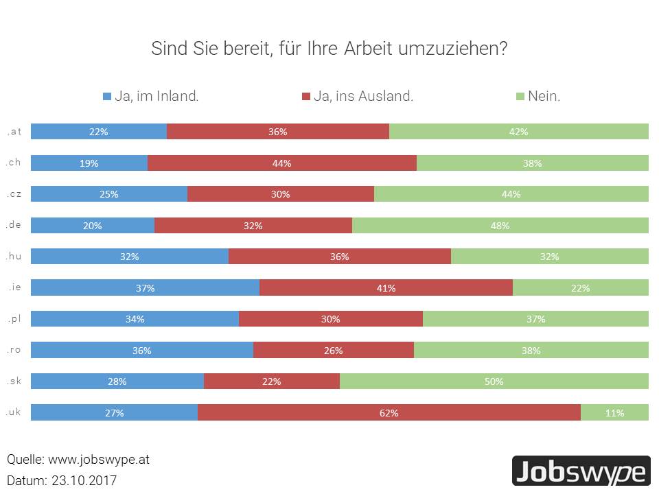 „Würden Sie für Ihren Traumjob auf einen anderen Kontinent ziehen?“ Die Auswertung der Jobswype-Umfrage aus Februar 2016 zeigte, dass zwischen 16 und 45 Prozent (Deutschland 16 %, Schweiz 17 %, Österreich 20 %, Vereinigtes Königreich 26 %, Tschechien 28 %, Irland 29 %, Ungarn 39 %, Polen 40 %, Rumänien 40 %) bereit waren, in ein anderes EU-Land zu ziehen.