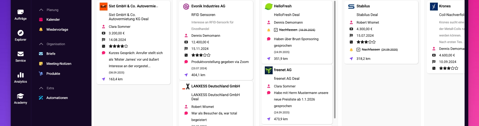 Dank der Einspeisung von künstlicher Intelligenz unterstützt das System Anwender mit Vorschlägen zur Neukundengewinnung, mit Follow-up-Empfehlungen und motivierenden Impulsen zur Optimierung des Vertriebsalltags.