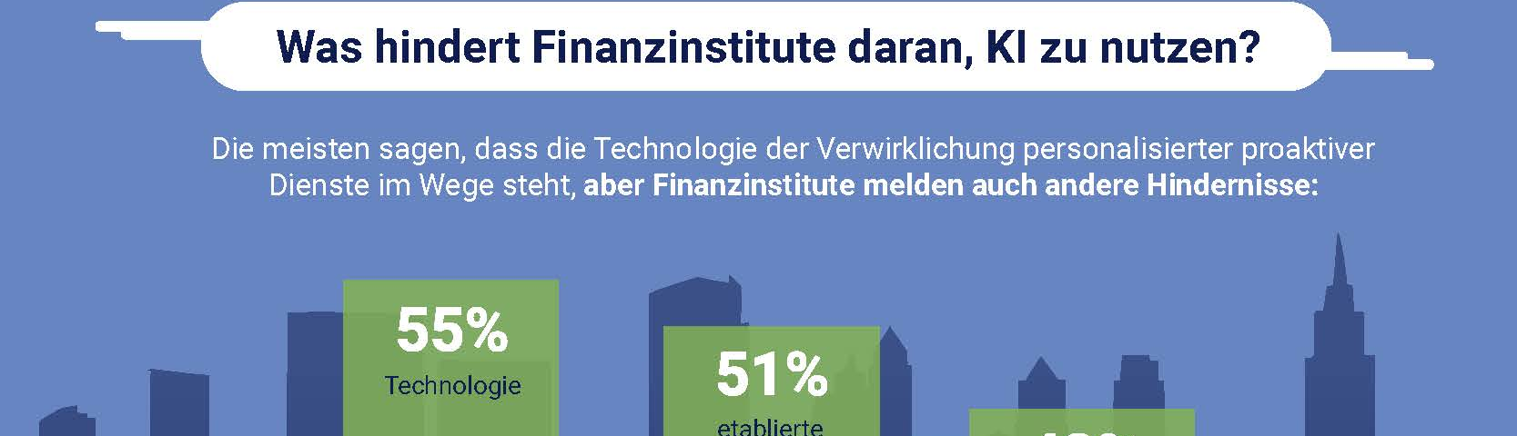 Finanzdienstleister berichten von Herausforderungen bei der KI-Implementierung, weil sie auch Änderungen auf der Fachseite erfordert. Die größten Herausforderungen für den Einsatz von KI zur Bereitstellung von individuellen Services sind: