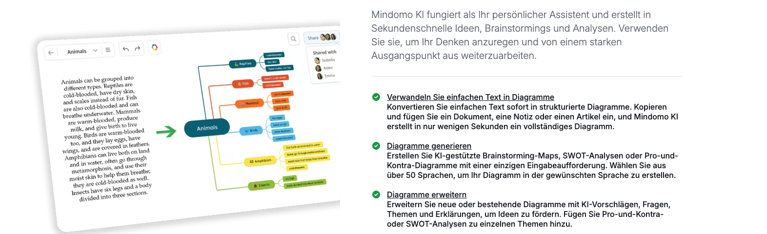 Mindomo verbindet klassische Mind-Mapping-Funktionen mit modernen KI-Technologien. Teams erhalten automatisch strukturierte Vorschläge für Themen, Unterthemen und Beziehungen, wobei der visuelle Ansatz das Denken erleichtert und kreative Prozesse fördert. Mit automatischer Ideengenerierung, der Möglichkeit zur Echtzeit-Zusammenarbeit und einer intuitiven Oberfläche unterstützt Mindomo die effiziente Planung komplexer Projekte in hybriden und verteilten Arbeitsmodellen.