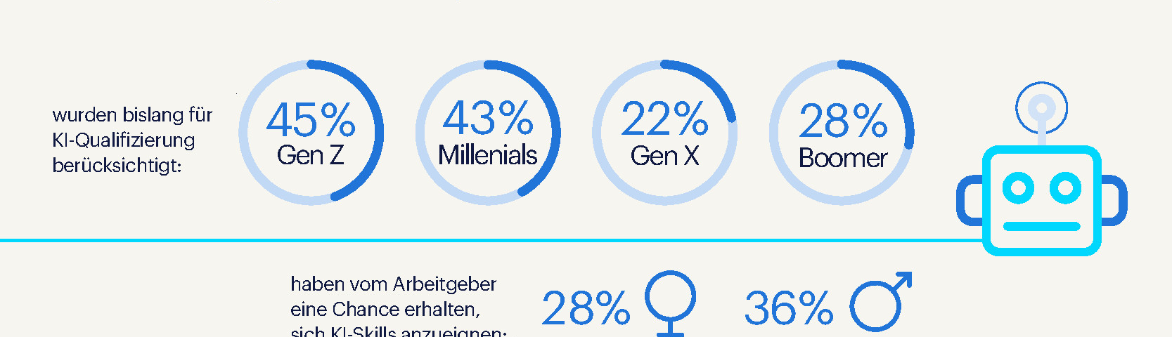 Eine deutliche Diskrepanz zeigt sich in der geschlechtsspezifischen Förderung: Während 36 % der Männer angeben, bereits KI-Schulungen erhalten zu haben, liegt der Anteil bei den Frauen nur bei 28 %. Zudem fühlen sich 36 % der Männer durch diese Qualifikationen befähigt, KI-Tools erfolgreich anzuwenden, verglichen mit nur 27 % der Frauen. Diese ungleichen Chancen schlagen sich auch in der Begeisterung nieder – so zeigen 52 % der Männer Interesse an KI, aber nur 41 % der Frauen.