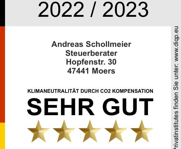 Der Steuerberater Andreas Schollmeier aus Moers, hat für sein Engagement im Bereich Umweltschutz die Zertifizierung des DIQP (Deutsches Institut für Qualitätsstandards und -prüfung e.V.) als „Klimaneutrales Unternehmen (DIQP)“ mit der Einstufung „sehr gut“ erhalten.