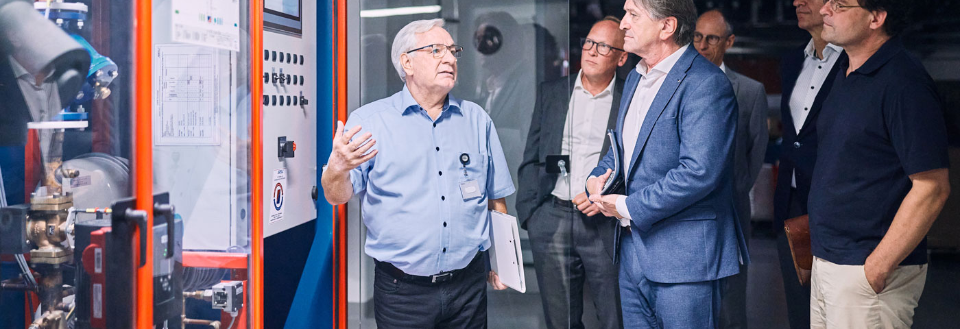 Beim Besuch von Sozialminister Manne Lucha und Bürgermeister Thomas Fuhrmann im Klinikum Stuttgart präsentierte Walter Ruschel, Technischer Leiter, die innovative GSWT-Technologie (Gegenstrom-Schicht-Wärmetauscher) von SEW.