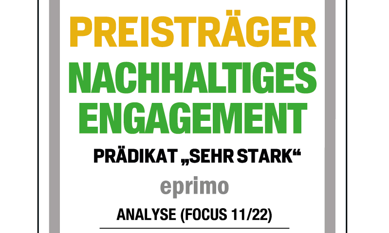 Welche Unternehmen übernehmen nach Einschätzung der Kunden soziale, ökonomische und ökologische Verantwortung und handeln nachhaltig? Um diese Frage zu beantworten, führte ServiceValue im 1. Quartal 2022 eine bundesweite repräsentative Online-Befragung durch. Die Meinungsforscher analysierten rund 480.000 Kundenurteile zu mehr als 1.500 Unternehmen aus 113 Branchen. Focus-Money zeichnet jetzt die Marken und Firmen aus, deren Nachhaltigkeit im Vergleich zur Branche überdurchschnittlich hoch bewertet wurde. eprimo gehört als kundenstärkster Anbieter für Ökostrom und Ökogas wie schon in den Vorjahren zur Spitzengruppe und wird als „Preisträger Nachhaltiges Engagement – Prädikat sehr stark“ ausgezeichnet.