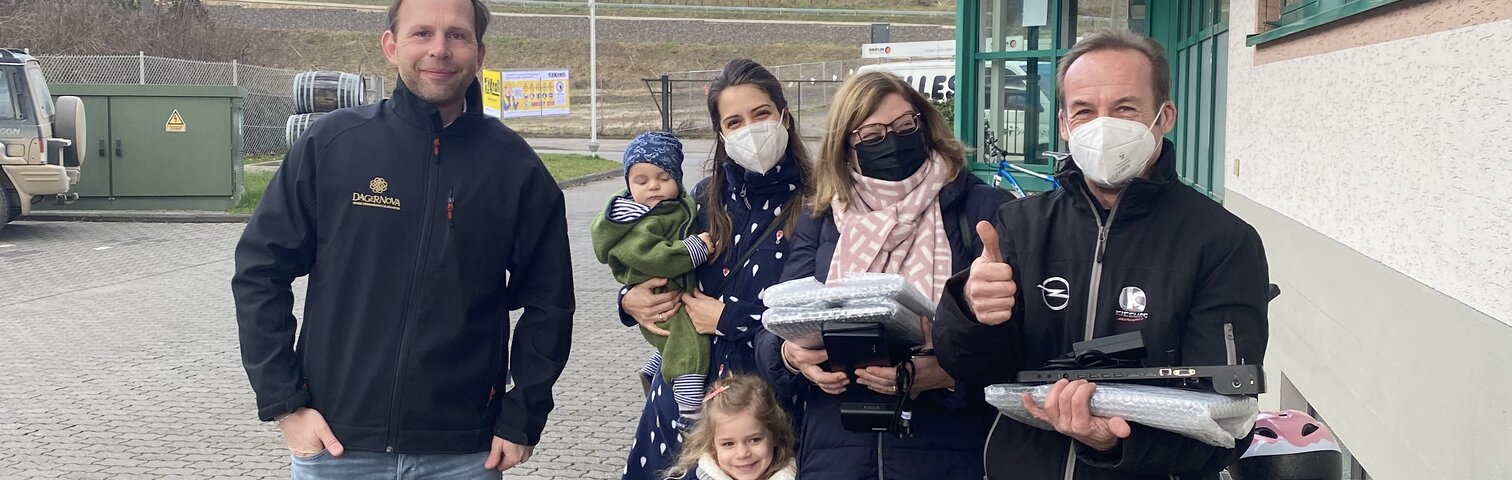 „Die Winzer aus dem Ahrtal haben eine lange Tradition und sind für die Region von immenser Bedeutung. Es ist wichtig, Schritt für Schritt zurück Richtung Normalität zu gehen“, so Dominik Hübinger vom Verein Ahr-Hilfe, der die Laptops entgegennahm und an die Winzerinnen und Winzer in der Region verteilen wird.
