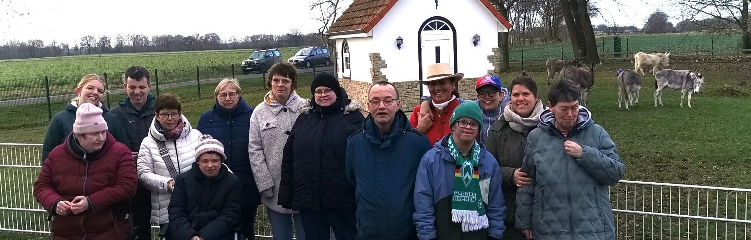 Der weihnachtliche, von Tabea Hartau organisierte Ausflug der Wohngruppe Sulingen der Lebenshilfe Grafschaft Diepholz sollte unbedingt auf die Ballermann Ranch führen. Hatten doch die vierzehn Tierfreunde erfahren, dass hier zwölf Esel aus einer dramatischen Rettung ein neues Zuhause gefunden haben. So bekam der „Clan der Sizilianer“, wie die Esel von Annette und Andre Engelhardt genannt werden, seinen ersten Besuch. Esel-Knuddeln war dann bei der Gruppe um Tom &. Jerry an der St. Leonhard Kapelle angesagt und auch Schnütchen Tessa sowie das alte Olympia-Springpferd Paul hatte Freude an den herzigen Gästen aus Sulingen.