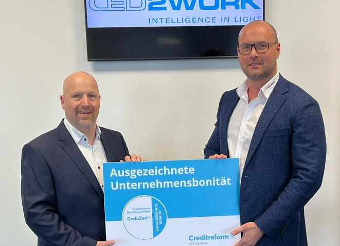 Trotz der aktuellen allgemeinen wirtschaftlichen Situation erfüllte die LED2WORK GmbH nach Müller & Schott GmbH & Co. KG alle Kriterien für die Verleihung des „CrefoZert“ in besonderem Maße. Basis der Zertifizierung ist eine professionelle Jahresabschlussanalyse durch die Creditreform Rating AG, einer BaFin-zertifizierten Tochtergesellschaft der Creditreform AG. Hinzu kommen die Daten der aktuellen Wirtschaftsauskunft sowie Einschätzungen zur aktuellen Situation und den Zukunftsperspektiven des Unternehmens.