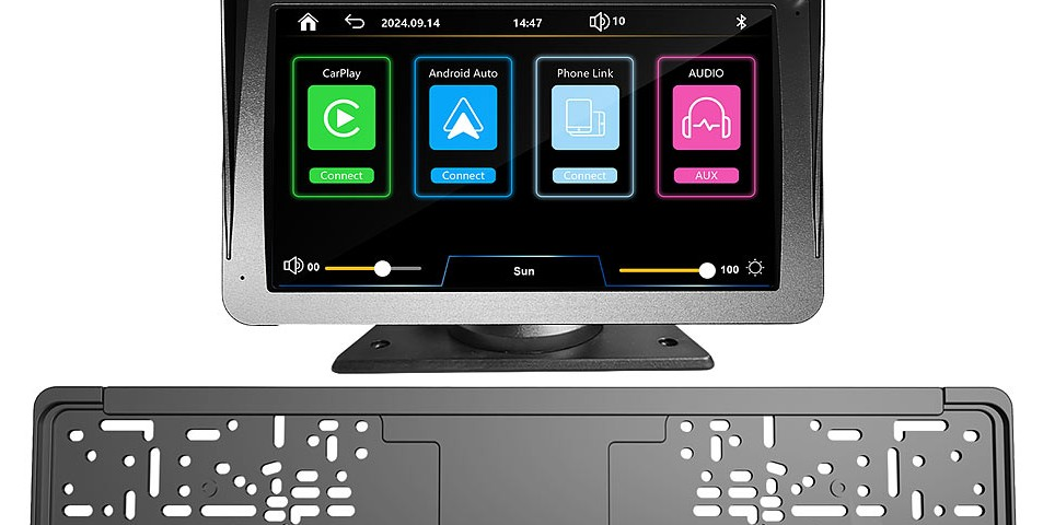 – Farb-Touchdisplay mit 7″ / 17,8 cm Diagonale: zeigt Kamerabild, Einpark-Hilfslinien, gibt akustische Abstands-Warnung, CarPlay- / Android-Auto-Anzeige, Screen-Mirroring, Anruf- und Musiksteuerung, Medienwiedergabe