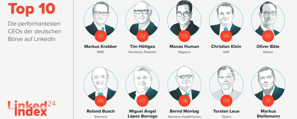Markus Krebber, CEO von RWE, steht mit seiner informativen, vielseitigen und zugänglichen Kommunikation zur Energiewende an der Spitze des Rankings. Er verdoppelt seine Followerzahl und die erhaltenen Reaktionen im Vergleich zum letzten Mal. Krebber wird dicht gefolgt von Tim Höttges (Deutsche Telekom) und Manas Human (Nagarro), die im Vergleich zum Vorjahr ihre Platzierung tauschen. Höttges betreibt über seinen Kanal Employer Branding und äußert sich regelmäßig zum Stand der Digitalisierung in Deutschland. Er kommuniziert dabei sehr nahbar und professionell. Manas Human, überraschender Neuzugang aus dem Vorjahr, behauptet sich mit seiner sehr persönlichen Kommunikation ebenfalls in der Spitzengruppe.