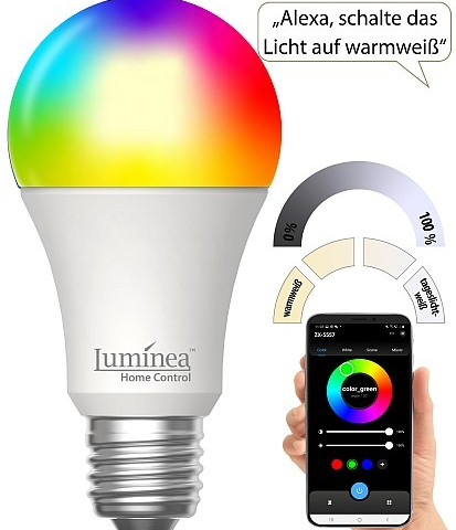 Mit der WLAN-LED-Lampe E27 von Luminea Home Control lässt sich die Beleuchtung individuell anpassen. Helligkeit, Farbtemperatur und Lichtfarbe lassen sich per iPhone, Android-Smartphone oder Tablet-PC steuern. Das Licht erstrahlt wahlweise in Warmweiß bis Tageslichtweiß oder in einer von 16 Millionen verfügbaren Farben.