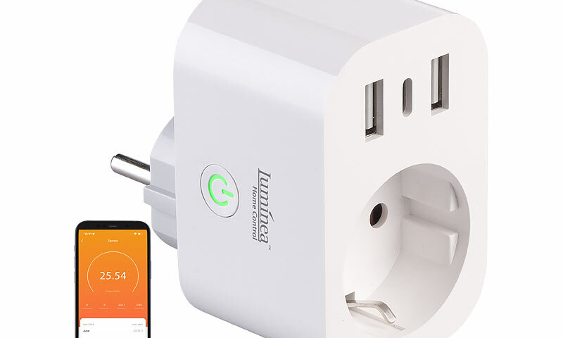 Luminea Home Control 2er-Set WLAN-Steckdose SF-515.avs mit Energiekostenmesser, 1 x USB-C 20 Watt, 2 x USB-A, 16A