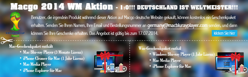 Die Promotionsseite von Macgo 2014 WM Aktion ist http://de.macblurayplayer.com/store.htm. Man kann auf dieser Seite Ihren Namen, Ihre Email und Bestellungsnummer an germany@macblurayplayer.com reichen, und dann können Sie Ihre Geschenke erhalten. Das Angebot ist gültig bis zum 17.07.2014.