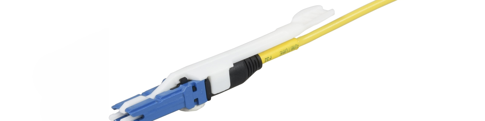 The CS connector is a fibre optic duplex connector up to 40 percent smaller than comparable LC duplex connectors. It integrates two ceramic ferrules with 1.25 mm diameter. Thanks to its standard equipment with push-pull tabs in four different lengths (48, 55, 62 and 69 mm), network engineers can handle the connector with ease. This makes it particularly suitable for applications with high packing density. CS connectors are available in multimode and single mode versions.