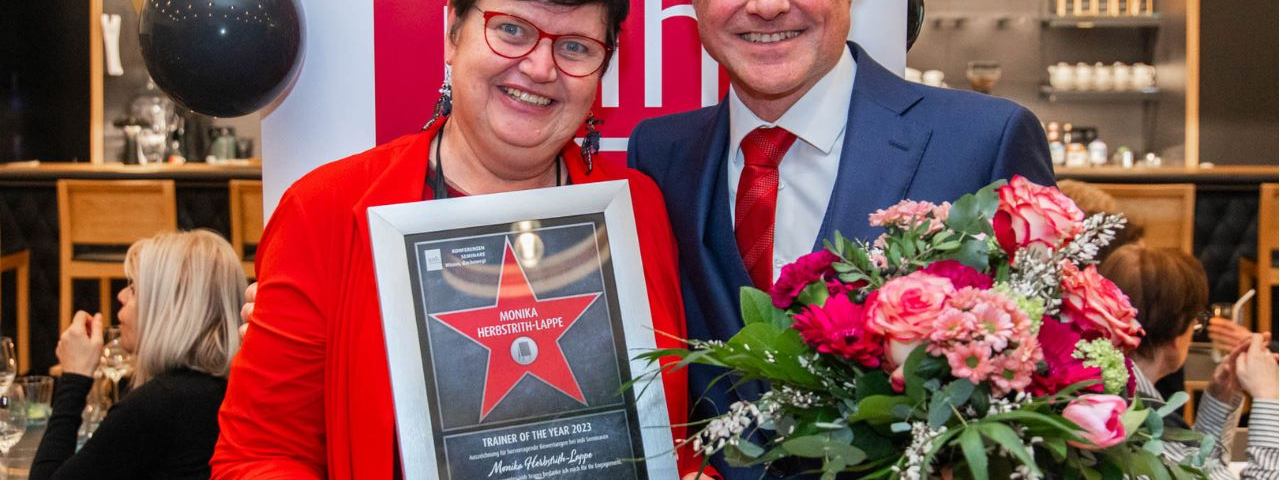 Das renommierte Manfred Hämmerle Institut (imh), vormals IIR, zeichnete kürzlich Frau Mag.a Monika Herbstrith-Lappe für ihre konstanten und bemerkenswerten Leistungen als „Trainer of the Year 2024“ aus. Es ist die 18. Auszeichnung, die sie innerhalb von 19 Jahren vom imh erhalten hat. Die Ehre wurde ihr aufgrund der außerordentlich positiven Rückmeldungen der Teilnehmer:innen ihrer Trainings und Konferenzen zuteil.