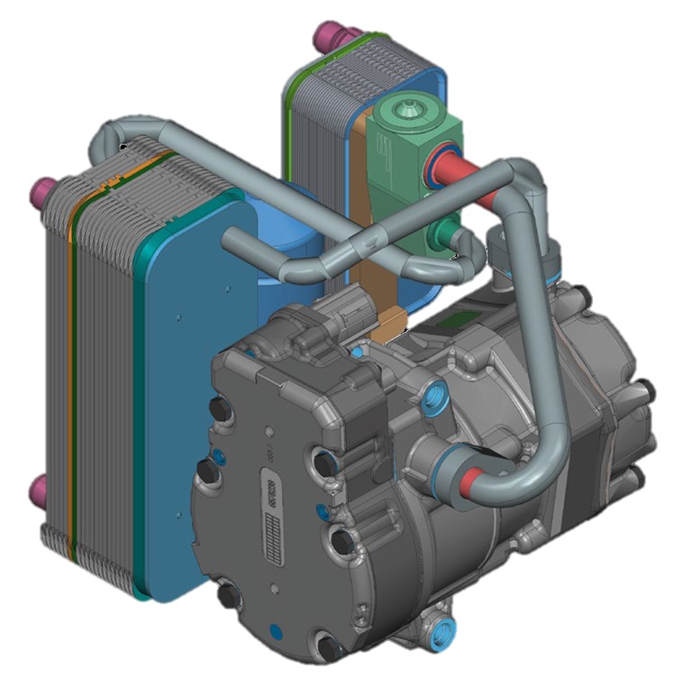 Das ITS von MAHLE kombiniert verschiedene thermische Komponenten in einem System, das mehrere Betriebsfunktionen erlaubt. Im Mittelpunkt seiner Architektur steht ein semihermetischer Kältekreislauf, der aus einem Chiller, einem kühlmittel-gekühlten Kondensator (i-Condenser) sowie einem thermischen Expansionsventil und einem elektrischen Antriebskompressor besteht. Der i-Condenser und der Chiller haben die gleiche Funktion wie der Kondensator und der Verdampfer in einem herkömmlichen Kältekreislauf. In diesem Fall jedoch überträgt das Kältemittel die Wärme anstelle von Luft an das Kühlmittel und erzeugt so warme bzw. kalte Kühlmittelströme. Das ITS verwendet R1234yf als Kältemittel und die herkömmliche Fahrzeugkühl-flüssigkeit als Medium für den Wärmetransport zwischen Kühlkreislauf und den verschiedenen Wärmequellen und -senken im Fahrzeug.
