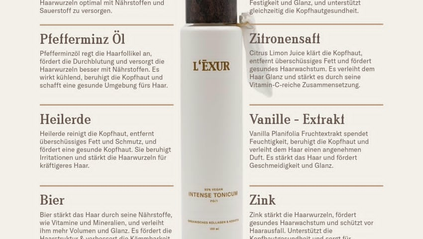 Zusätzlich zur Haarpflege legt L’EXUR großen Wert auf die Gesundheit der Kopfhaut – denn gesundes Haar beginnt an der Wurzel. L’EXUR-Produkte sind mit nährenden Inhaltsstoffen wie Aloe Vera und Rosmarin angereichert, die die Kopfhaut beruhigen, Entzündungen vorbeugen und so die idealen Bedingungen für kräftiges Haarwachstum schaffen. Diese ganzheitliche Pflege sorgt dafür, dass das Haar optimal versorgt wird und Haarausfall reduziert wird.
