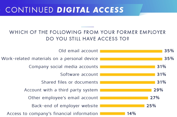 Zu den häufigsten Hacks und Verstößen gehörten das Einloggen in die sozialen Medien des Unternehmens (36 %), das Durchsuchen von Unternehmens-E-Mails (32 %) und das Mitnehmen von Unternehmensdateien (31 %). Mehr als einer von vier ehemaligen Mitarbeitern ging sogar so weit, sich in das Backend der Unternehmenswebsite einzuloggen.