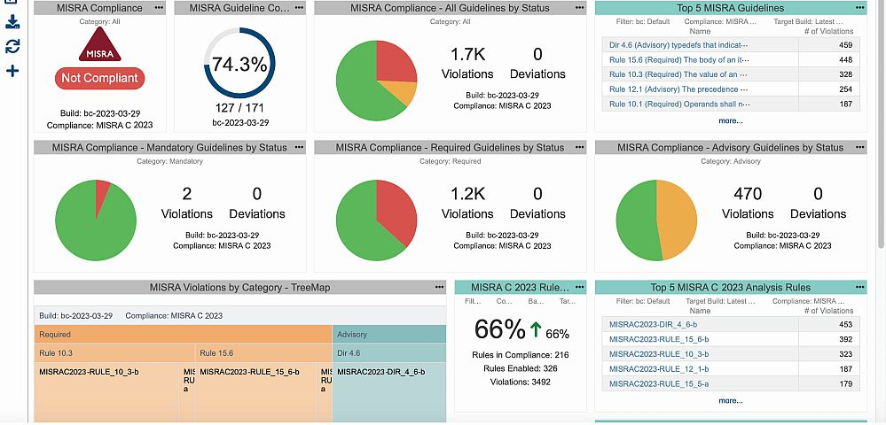 Das Parasoft Compliance Reporting Modul wurde entsprechend aktualisiert, um sicherzustellen, dass MISRA-konforme Berichte in Parasoft DTP verfügbar sind und Testergebnisse in intelligenten Dashboards, detaillierten Berichten und umsetzbaren Analysen konsolidiert werden. Dadurch können Unternehmen die Konformität mit der neuesten Version des Standards MISRA C:2023 sicherstellen.
