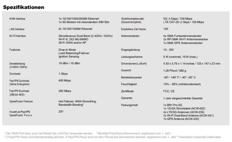 Das Datenblatt in deutscher Sprache mit allen Produktspezifikationen finden Sie hier: https://vitel.de/wp-content/uploads/2021/08/Pepwave_BR1_Pro_5G_Datenblatt.pdf