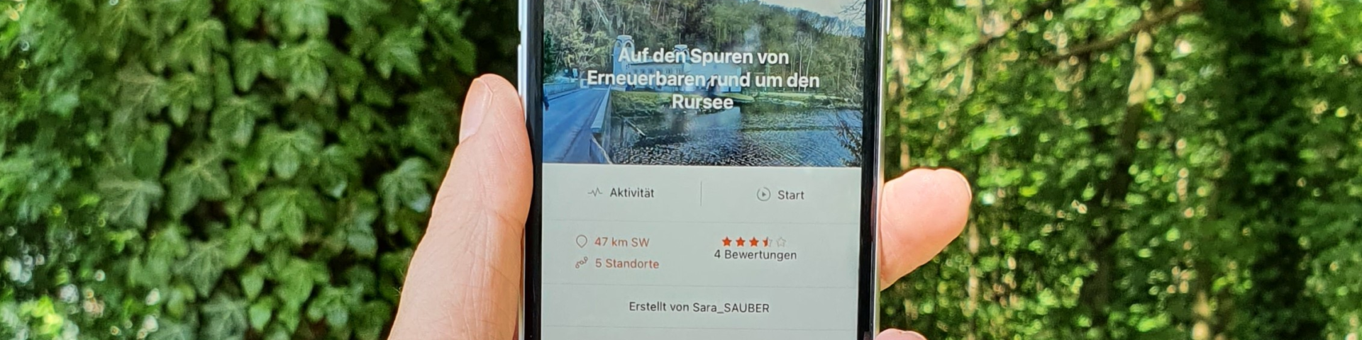 Auf der Tour von SAUBER ENERGIE werden die Geocacherinnen und Geocacher auf einer Route von 13 Kilometern entlang des Rursees in der Eifel über teils holprige aber ungefährliche Wege geführt. Doch auf ihrer Tour werden die modernen Schnitzeljägerinnen und Schnitzeljäger mit den Folgen eines (fiktiven) Energie-Blackouts konfrontiert: Was wäre, wenn es plötzlich keinen Strom mehr gäbe? Die Lösung liegt ebenfalls in der Natur – in Erneuerbaren Energien. Wie das konkret funktionieren kann, zeigt SAUBER ENERGIE anschaulich mit dem eigens erstellten Geocache in der „Adventure Lab“-App von Geocaching.com. Hier lernen die Teilnehmerinnen und Teilnehmer, dass das Potenzial für Erneuerbare Energien direkt vor der Haustür besonders groß ist und zugleich einen Mehrwert für die Energiewende bietet.