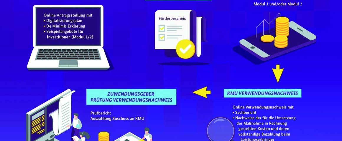 Das Bundesministerium für Wirtschaft und Energie (BMWi) fördert jetzt kleine und mittelständische Unternehmen mit finanziellen Zuschüssen bei Investitionen in digitale Kommunikationstechnologien. Die minimale Fördersumme beträgt 17.000 Euro. Das Programm soll Firmen dazu anregen, mehr in digitale Technologien zu investieren, denn die Digitalisierung trägt zum wirtschaftlichen Überleben in Krisensituationen bei, und eröffnet neue wirtschaftliche Chancen.
