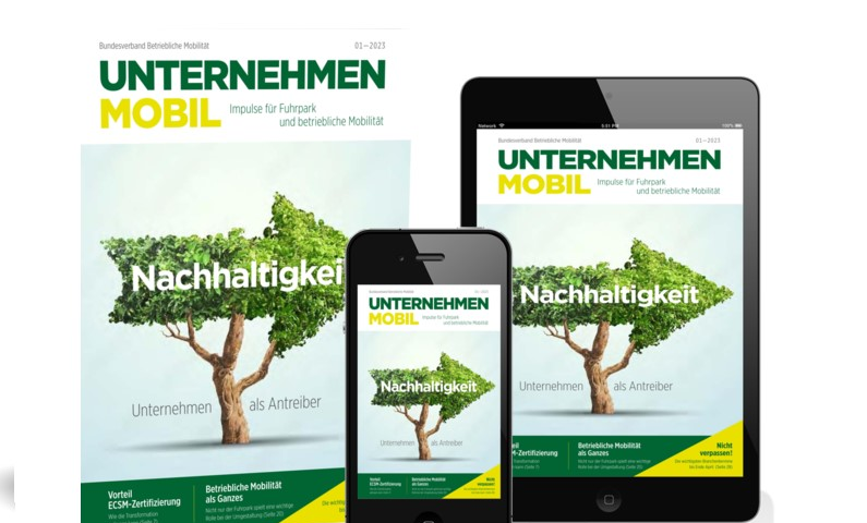 Informationsgeladen, nachhaltig, digital / Wissensmagazin für Entscheider / Fachbeiträge, Termine und wichtige Infos rund um die betriebliche Mobilität / erste Ausgabe: Titelthema Nachhaltigkeit /