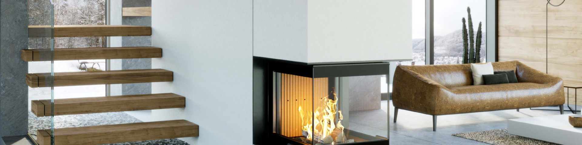 Der kompakte Heiz-Kamineinsatz KALA ist in sieben Ausführungen verfügbar, passend für jedes Interieur und mit viel Einblick in den Flammentanz: Mit zwei oder dreiseitigem Glaskörper – von Ecksicht, über Panorama-, Quadrat- bis U-Sicht. Neu im Sortiment sind die flache Glasfront und die Durchsichtversion. Die beiden neuen Varianten sowie U- und Eck-Sicht sind mit einer hochschiebbaren oder schwenkbaren Tür erhältlich.