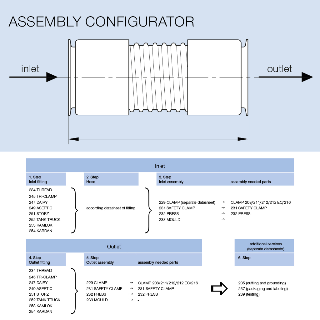 In Schritt eins bis drei konfigurieren Kunden die Einlaufseite der Schlauchleitung und wählen das entsprechende Anschlussteil, den passenden Schlauch sowie die Montageart aus. Je nach Produkt kann das Anschlussteil gepresst, geschraubt, geklemmt oder angegossen werden. Anschließend wird die Auslaufseite der Schlauchleitung konfiguriert, in dem der Kunde auch in Schritt vier und fünf das Anschlussteil auswählt, dann die gewünschte Montageart. Schritt Nummer sechs bietet dem Kunden zusätzliche Benefits in Form verschiedener Dienstleistungen an – dazu zählen: das Schneiden des Schlauches auf Kundenwunsch, Auswahl der Verpackungsart und Etikettierung sowie Eignungsprüfungen samt Prüfplaketten auf Kundenwunsch.