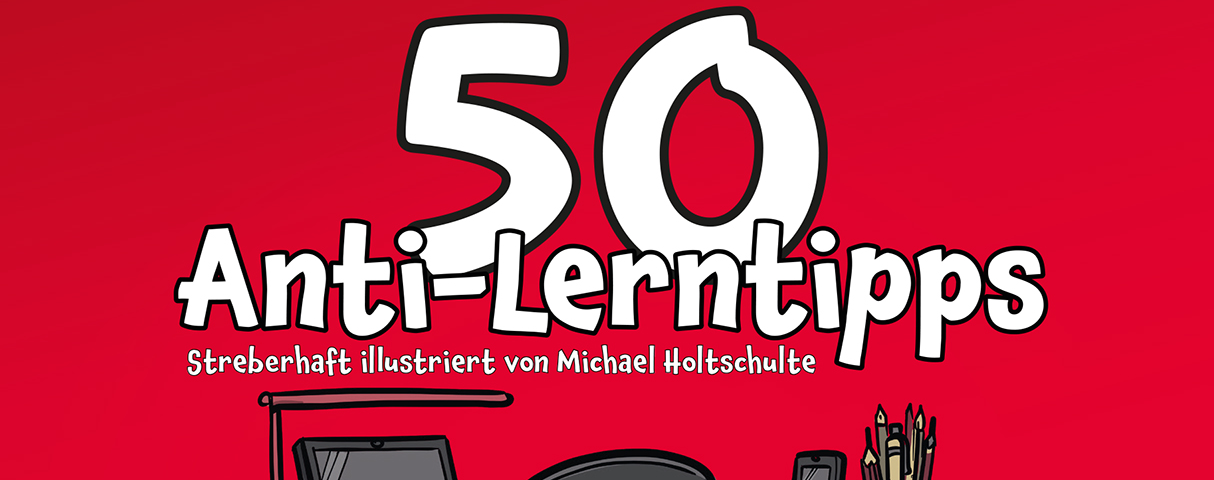 Aber Vorsicht: Das 72 Seiten starke Booklet enthält ausschließlich Tipps, die man als Schülerin oder Schüler besser nicht befolgt. „Mache deine Hausaufgaben im Bus, die Besten lernen unter den härtesten Bedingungen“, „Trink beim Lernen nichts, dein Körper besteht eh zu 6 0 Prozent aus Wasser“, „Schreibe im Unterricht nichts mit. Damit trainierst du dein Gedächtnis.“ Wer solche Ratschläge in die Tat umsetzt, verbessert seine Noten garantiert nicht. Wer aber genau das Gegenteil tut, kann durchaus seinen Nutzen daraus ziehen. Illustriert hat die „50 Anti-Lerntipps“ der Cartoonist und Karikaturist Michael Holtschulte – vielen bekannt durch seine Cartoon-Reihe „Tot, aber lustig“. Wer mehr über Michael Holtschulte erfahren möchte, kann ihn im Studienkreis-Podcast „Die letzte Reihe“ ( studienkreis.de/die-letzte-reihe) an der Seite von Gastgeber Max Kade erleben.