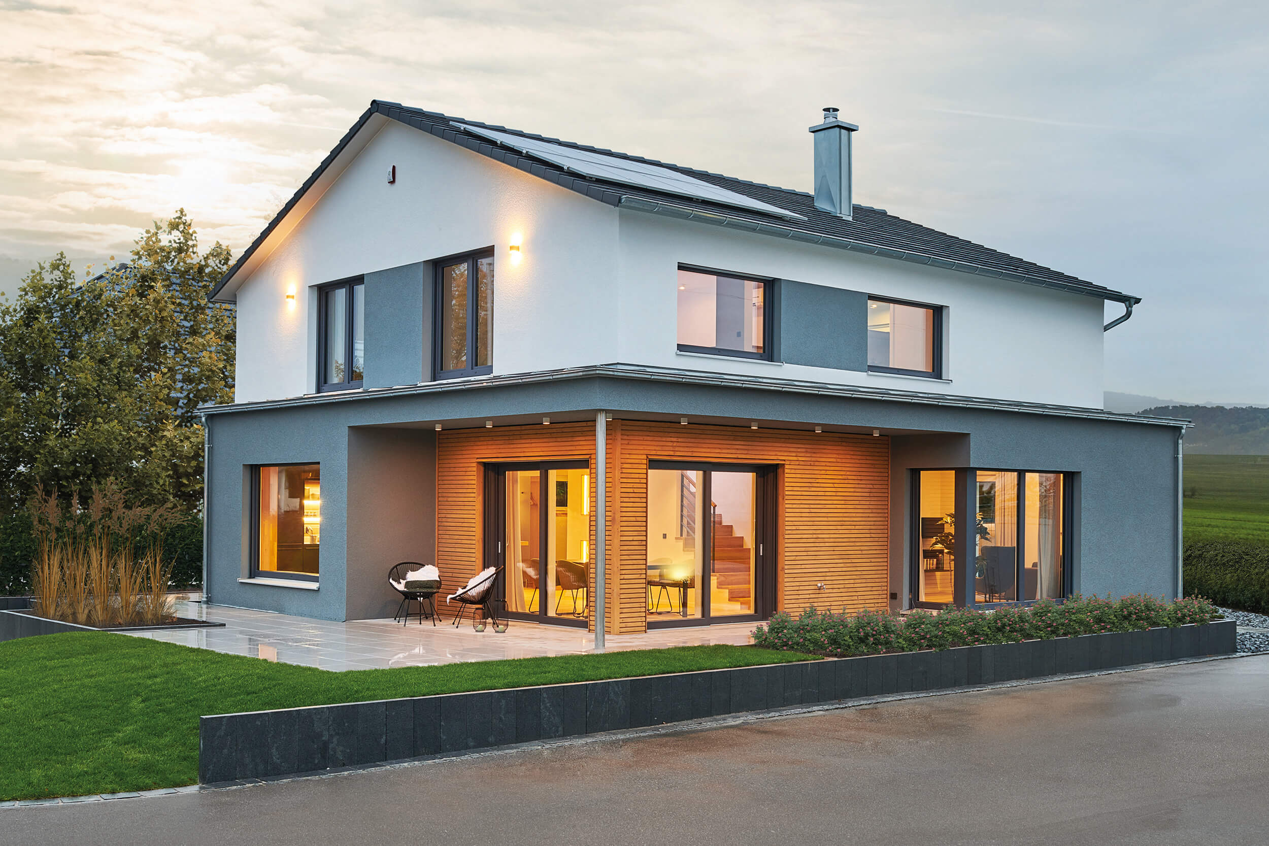 Das augenfälligste gestalterische Element sind die beiden Erker des Musterhauses, die mittels einer Terrassenüberdachung nahtlos und harmonisch miteinander verbunden sind. „Ziel dieses gestalterischen und praktischen Elements ist, der Terrasse einen Raum, einen Halt zu geben und gleichzeitig der Fassade eine horizontale Zäsur, um der Kubatur eine harmonische Proportion zu verleihen“, erläutert Volker Koch, Architekt des Musterhauses und Vertriebsleiter bei Fertighaus WEISS. „Die dunkelgrau verputzten Erker sind in Verbindung mit der Holzschalung ein echter Blickfang. Zusätzlich schaffen wir auf diese Weise praktische Flächen, um Gartenmöbel oder Grill abzustellen.“ Die Erker und der Gebäuderücksprung, der einen großzügigen Eingangsbereich schafft, verwandeln den klassischen Kubus des Einfamilienhauses in ein spannendes geometrisches Ensemble mit fast quadratischen Außenmaßen von 10,50 x 11 Metern. Dank des Satteldaches mit flacher Neigung (22°) und der eineinhalbgeschossigen Bauweise ist das Haus auch in konservativeren Gemeinden genehmigungsfähig. Das Farb- und Materialkonzept des WEISS-Musterhauses beruht auf dem stimmigen Zusammenspiel von kühlem Grau und warmen Holztönen. Fensterflächen wurden, wie in der modernen Hausplanung üblich, zum Garten hin großzügig und zur Straßenseite hin sparsamer eingesetzt.