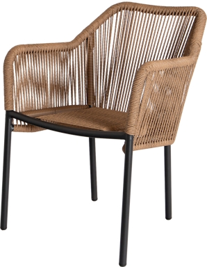 Der Terrassenstuhl „Minerva“ ist schon eher ein Sessel als ein Stuhl. Die Rückenlehne geht nahtlos in die Armlehnen über und umhüllt seinen „Besitzer“ auf angenehmste Art und Weise. Seine Binsenoptik strahlt ganz automatisch Behaglichkeit aus. Aber keine Angst: Bei Regen wird das Geflecht nicht von Wasser durchtränkt, denn es besteht aus einem Spezialkunststoff. Dieser ist wetterfest und bleicht nicht aus. Das Gestell ist ebenso unempfindlich, denn es ist aus pulverbeschichtetem Aluminium gefertigt. Schon beim Anblick kann man sich vorstellen, wir bequem der Stuhlsessel ist.