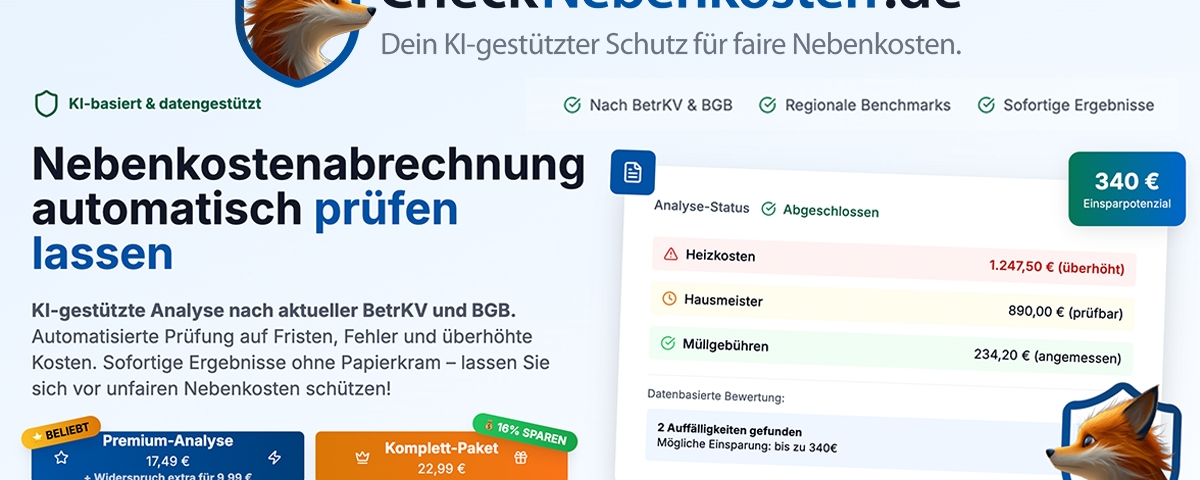 CheckNebenkosten.de ist eine digitale Plattform zur automatisierten Prüfung von Nebenkostenabrechnungen. Das in Deutschland entwickelte Tool nutzt künstliche Intelligenz und regionale Vergleichswerte, um Mieter schnell, verständlich und datengestützt auf mögliche Fehler oder Überhöhungen hinzuweisen. Die Web-App ist DSGVO-konform, mobil optimiert und bietet kostenlose Basisfunktionen sowie eine erweiterte Premium-Analyse inklusive Handlungsempfehlungen und optionalem Widerspruchsservice.