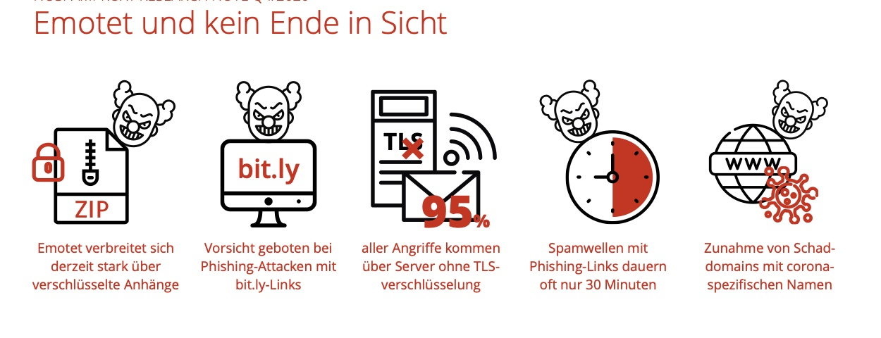 In der ersten Research Note teilt das Heimdall-Team seine Beobachtungen zur starken Verbreitung des Trojaners Emotet über verschlüsselte Anhänge sowie zu Phishing-Attacken mit Links des bekannten URL-Shortener-Dienstes bit.ly. Außerdem wird erläutert, wie Angreifer Spam- und Phishing-Wellen über Zero-Days-Domains einsetzen, dass 95 Prozent aller Angriffe über E-Mail-Server ohne TLS-Verschlüsselung erfolgen und dass Schaddomains mit Corona-Bezug im Namen stark zugenommen haben.