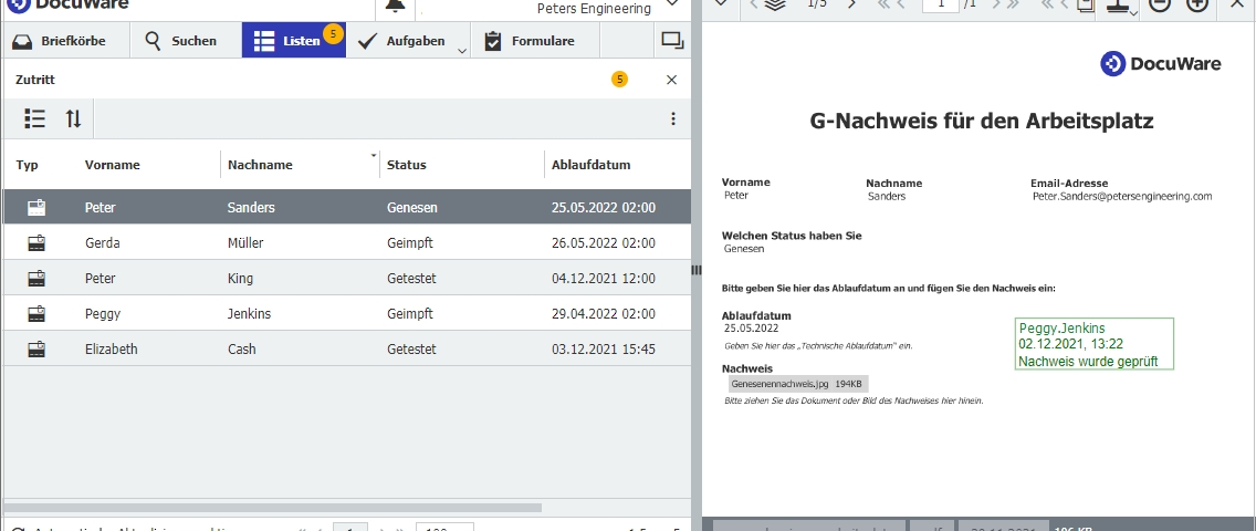 „DocuWare für G-Nachweis am Arbeitsplatz“ unterstützt Unternehmen dabei, die aktuelle Gesetzgebung umzusetzen. Der G-Status wird vertraulich abgefragt und die sensiblen Informationen rechtssicher und datenschutzkonform verwaltet. Beschäftigte, die ins Unternehmen kommen, können ihren G-Status und Nachweis im Vorfeld bequem online übermitteln. Betriebe haben immer automatisch eine aktuelle Gesamtübersicht, wer Zutritt erhält. Bei auslaufenden Zertifikaten wird eine automatische Erinnerung verschickt und sechs Monate nach Erfassung werden die sensiblen Daten dem Gesetz entsprechend über einen sicheren Prozess gelöscht. Für Betriebsprüfungen sind Arbeitgeber gewappnet und können ihrer Nachweispflicht leicht nachkommen.