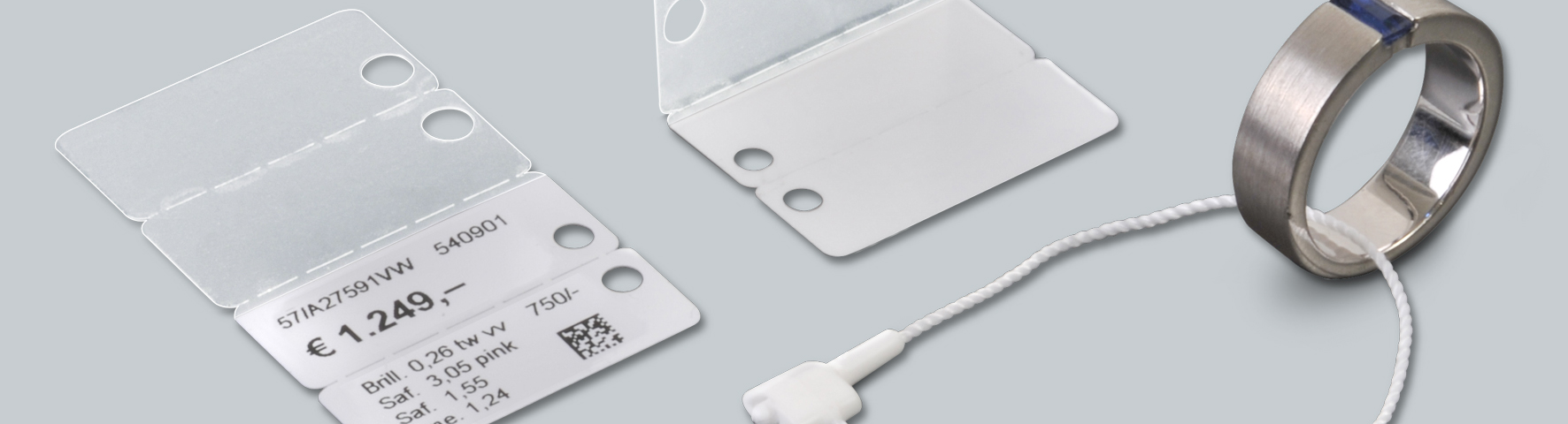 WrapTags als Anhänge-Etiketten sind vielseitig einsetzbar. Sie können entweder halbautomatisch mittels Fadenpistole oder manuell über Textilfäden an praktisch jeder Art von Schmuck angebracht werden. Für einfache Anforderungen eignen sich vorgeknüpfte Fäden zum Durchschlaufen.