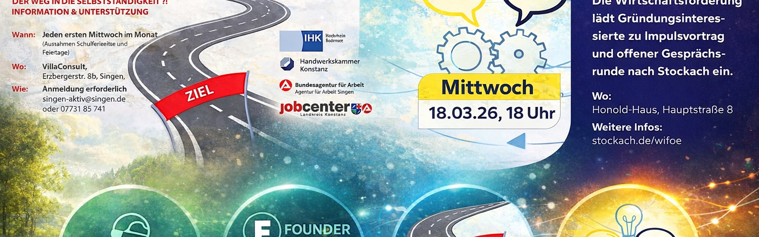 Ergänzend wird es in der Region weiterhin ein bewährtes Informationsformat geben: die „Impulsnachmittage“ von Singen aktiv Standortmarketing. Die Reihe richtet sich an Gründungsinteressierte und findet regelmäßig am 1. Mittwoch im Monat statt. Das Konzept ist bewusst niedrigschwellig aufgebaut: Eine kompakte Einführung bildet den Auftakt, danach folgt ein Spezialthema mit Expertinnen und Experten aus dem Netzwerk. Die Teilnahme ist kostenlos, eine Anmeldung wird erbeten. Interessierte können sich hier anmelden: Online-Anmeldung Impulsnachmittage