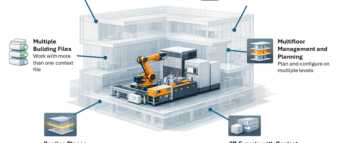 Mit der neuen Hauptversion 14 der P´X Industry Solution werden Maschinen und Anlagen nun noch einfacher im virtuellen Einbauraum errichtet. Mit einem neuen Workflow wird der Import für Gebäudedaten sicherer und leistungsfähiger. Die Planung und Verwaltung mehrere Stockwerke, Schnitt- und Ausschnittebenen erleichtert die Kollaboration mehrerer Fachbereiche ebenso wie den 3D-Export. Die mit über 100 Parametern und Constraints konfigurierbaren Anlagenkomponenten werden im IFC-Format des Building Information Modeling (BIM) per „drag and drop“ platziert. Dies gilt für konfigurierte Maschinen ebenso wie für fremde Objekte.