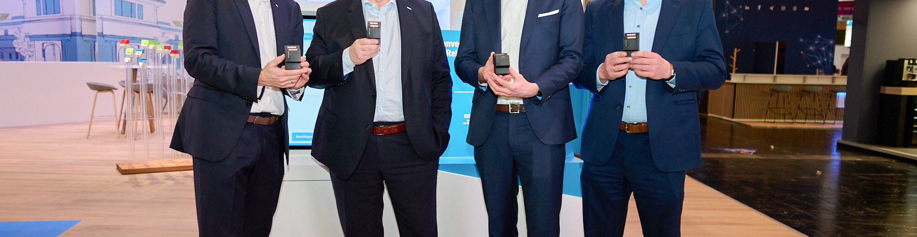 Präsentieren den neuen EEBUS Relais Converter auf der E-world: (v. l. n. r.) Dr. Timo Berger, Chief Technology Officer bei Weidmüller, Ingo Schönberg, Vorstandsvorsitzender von PPC, Dr. Christian von Toll, Chief Sales Officer bei Weidmüller, und Janosch Wagner, Chief Technical Officer bei PPC (Bild: Power Plus Communications).