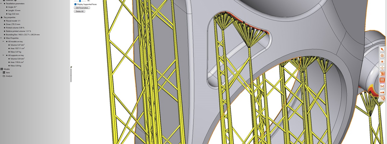 Für eine bessere Qualität der anderen Downskin-Bereiche werden Baumstrukturen erzeugt, deren Anknüpfungspunkte mit dem Bauteil weniger Kontaktflächen aufweisen und so eine teure und zeitaufwendige Nacharbeit verringern. Eine wesentlicher Vorteil von Baumstrukturen ist zudem, dass sie weniger Kontaktfläche auf der Bauplattform generieren, indem die Verästelungen auf einigen zentralen Stämmen in die Höhe wachsen. Hierbei werden die Kontaktpunkte am Bauteil sowie Äste gezielt gelöscht oder hinzugefügt, um die automatisch erzeugten Stützstrukturen durch den Anwender bei Bedarf zu verändern.