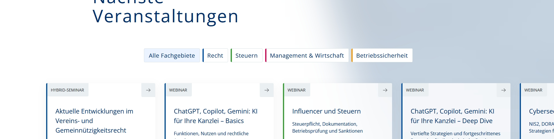 So bietet der neue Veranstaltungskalender jetzt intelligente Such- und Filtermöglichkeiten, mit denen sich Seminare, Webinare und Lehrgänge gezielter nach Fachgebiet und Themen, Referierenden und Zeitraum finden lassen. Auf den übersichtlich gestalteten Informationsseiten zur Veranstaltung sind alle wichtigen Informationen noch kompakter dargestellt – inklusive der Möglichkeit eines Kalendereintrags und PDF-Exports zur persönlichen Planung. Neue Themenseiten bündeln schließlich das gesamte Fachgebietsangebot – von Arbeitsschutz über Compliance, FAO-Fortbildungen und KI bis zu Non-Profit und Steuerrecht.