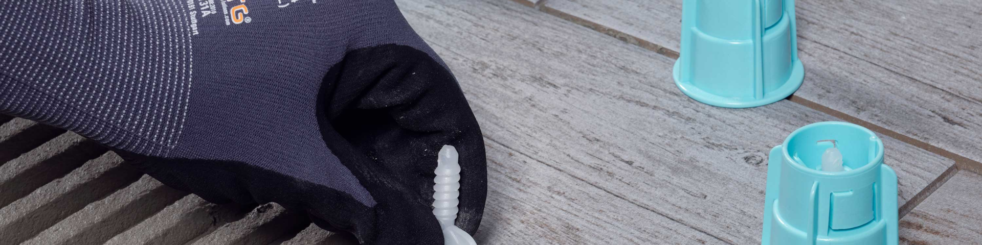 Grund dafür: Es sind nur drei Arbeitsschritte notwendig. Nach dem Einsetzen der Gewindelasche in das frische Kleberbett wird die Fliese verlegt. Dann wird der Drehknopf über die Gewindelasche geschoben. Diese rastet dabei hörbar ein. Nach wenigen weiteren Umdrehungen sind die Beläge perfekt nivelliert. Durch die griffige Größe geht das mühelos – ideal für große Flächen. Als letzter Schritt werden die Drehköpfe nach dem Aushärten des Klebers einfach abgeschlagen. „Hierbei haben wir im Sinne der Nachhaltigkeit dafür gesorgt, dass sowohl der Drehknopf als auch die Gewindestäbe wiederverwendet werden können“, so Rayc Wulst. Dazu reicht ein leichter Druck auf die Schnellarretierung, und die im Drehknopf verbleibenden Gewindestäbe werden freigegeben. Diese eignen sich als Abstandshalter für Wand- oder Sockelverlegung.