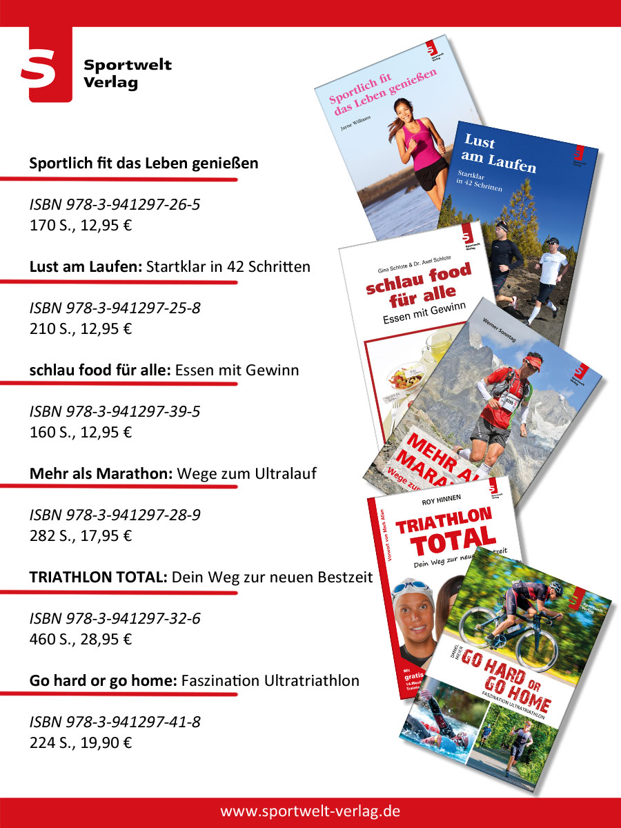 Der Sportwelt Verlag wurde 2006 gegründet. Der thematische Fokus liegt auf dem Ausdauersport und hier insbesondere auf Triathlon, Laufen und Radsport. Was nach einem eng begrenzten Spezialgebiet klingt, bietet dennoch ein riesiges Betätigungsfeld, das von hochwertiger Trainingsliteratur über interessante Biografien und klassischer Unterhaltungslektüre bis hin zur optimalen Ernährung für Sportler reicht. Weitere Informationen unter: www.sportweltverlag.de